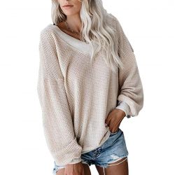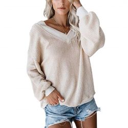 Women's Off Shoulder Pullover Tops Casual V Neck Long Sleeve Waffle Knit Sweaters