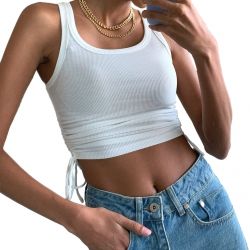 Women's Sleeveless Shirt Ribbed Drawstring Side Ruched Cami Scoop Neck Basic Knit Vest Slim Fit Crop Tank Tops