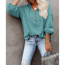 V Neck Loose Hoodies for Women Long Sleeve Henley Shirt Drawstring Solid Color Sweatshirt Button Pullover Tops